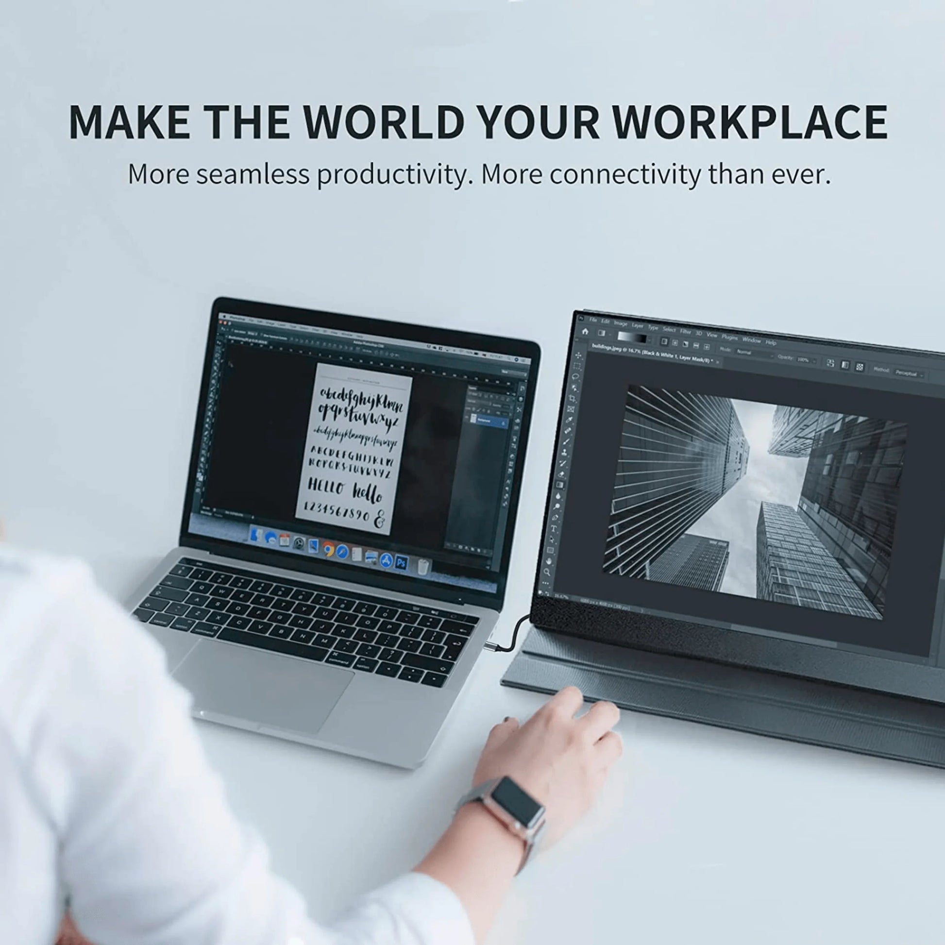 - Connect with ease. The travel monitor comes with two USB-C ports and a Mini-HDMI port that conveniently connect to laptops, PCs, phones, gaming consoles, and more. Single cable USB-C connectivity offers flexibility, reducing cable clutter and streamlining your workspace.